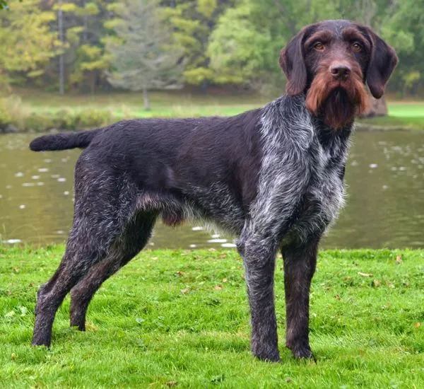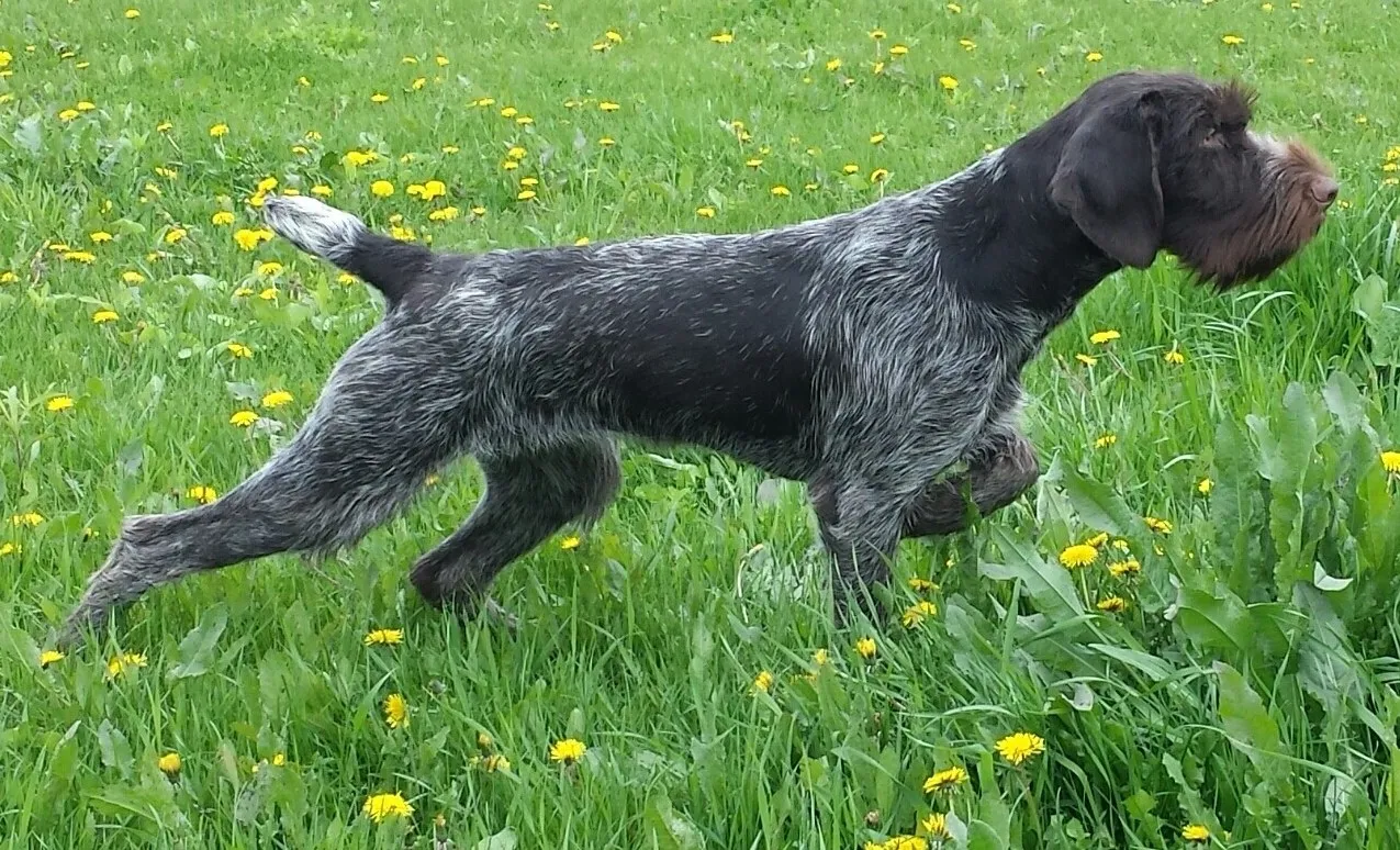 Немецкая жёсткошёрстная легавая имеет гармоничное, слегка растянутое телосложение. Корпус крепкий, но без излишней массивности: мускулатура рельефная, сухая, хорошо выражены грудная клетка и поясница. Благодаря такой структуре дратхаар устойчив на любой поверхности и демонстрирует отличную выносливость в длительной работе.